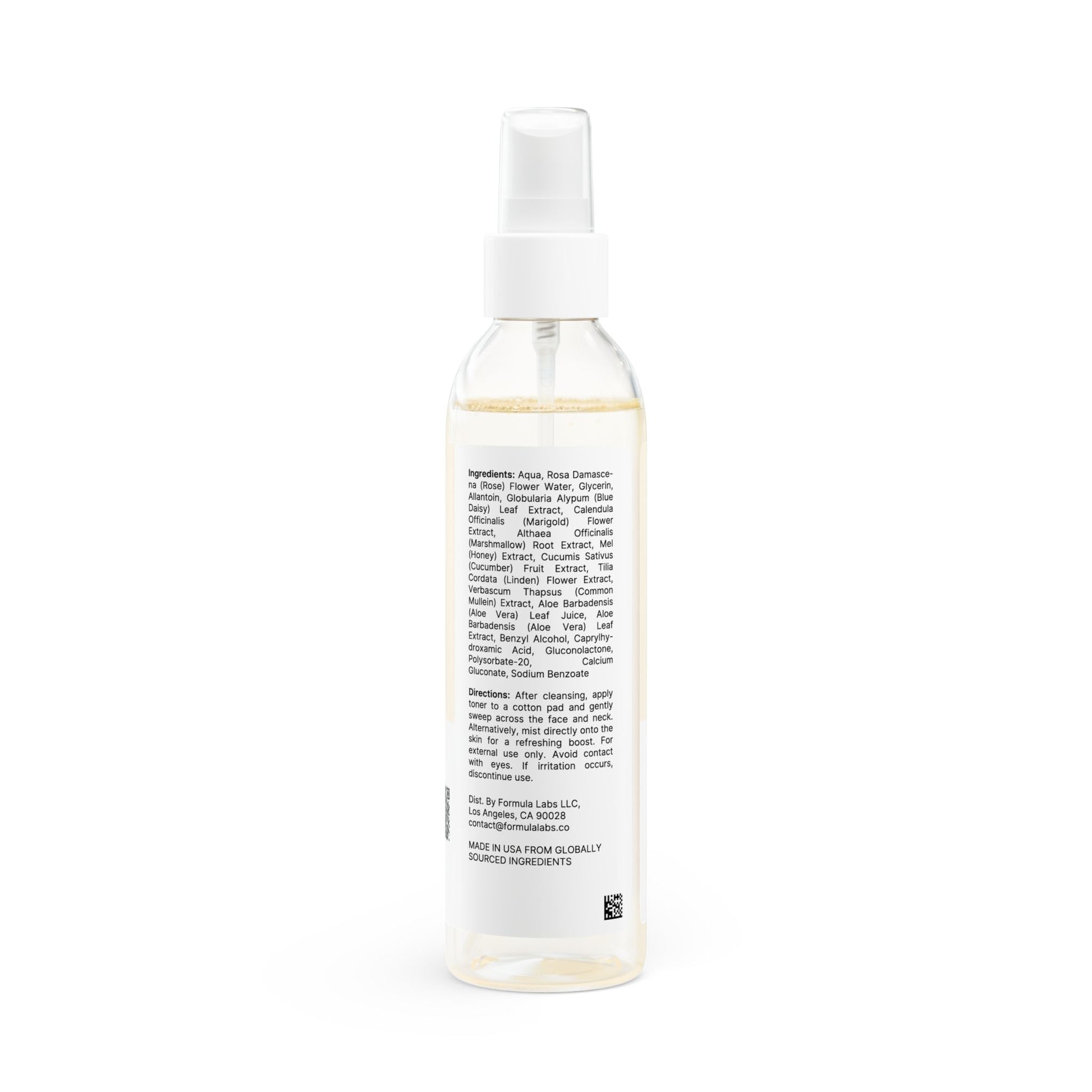Ingredients: Aqua, Rosa Damascena (Rose) Flower Water, Glycerin, Allantoin, Globularia Alypum (Blue Daisy) Leaf Extract, Calendula Officinalis (Marigold) Flower Extract, Althaea Officinalis (Marshmallow) Root Extract, Mel (Honey) Extract, Cucumis Sativus (Cucumber) Fruit Extract, Tilia Cordata (Linden) Flower Extract, Verbascum Thapsus (Common Mullein) Extract, Aloe Barbadensis (Aloe Vera) Leaf Juice, Aloe Barbadensis (Aloe Vera) Leaf Extract, Benzyl Alcohol, Caprylhydroxamic Acid, Gluconolactone, Polysorbate-20, Calcium Gluconate, Sodium Benzoate.